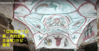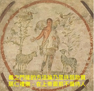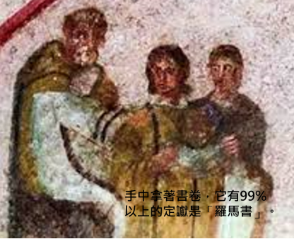 附圖是「亞居拉地下巨墓」之圓頂壁畫,主後第3世紀,羅馬城,謝謝義大利國家及其人民禮讓版權。其中心主旨(圓心)畫著一位羅馬高階官吏,從他的服裝和〔佩劍〕辨認出來。(羅13:4,他不是空空地〔佩劍〕;他是上帝的用人,是伸冤的,刑罰那作惡的。)他正在「餵養我的群羊(約21:15-17)」,亦即正在做出第二版羅馬書第1-2章祭壇文學的中心主旨和畫龍點睛,說:「義之門徒的方法論乃是扶弱助貧居仁禮樂,在上帝面前不偏待人。」。本網站憶測:佔據中心主旨的這個人就是「亞居拉地下巨墓」的 墓主,這證實了腓1:13有〔御營全軍〕歸主了。