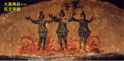 該壁畫的右下角有『火窯典故(但3:19-27,其詳細圖顯示於下)』,這證實羅馬皇帝大屠殺基督徒從羅馬書時代到主後第3世紀始終是存在的,但義之方法論勿受其它人事時地物型之壓力而陷入邪惡。