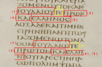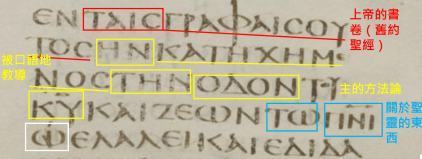 請看西奈抄本的徒18:24-25,左下角的白框白字,有一撇斜畫在文字上面,表示這裡抄寫出錯字。請看紅框紅字處,是冠詞、陰性、多數、間接受詞,其尾隨的紅線紅字也必須是陰性名詞、多數、間接受詞,意思是「書卷」。根據猶太文化的潛意識:凡修飾與三位一體者有關的東西,一律使用多數,所以「多數書卷 == 三位一體者的書卷 == 舊約聖經,包含有希伯來文和七十士譯本(希臘文)」。