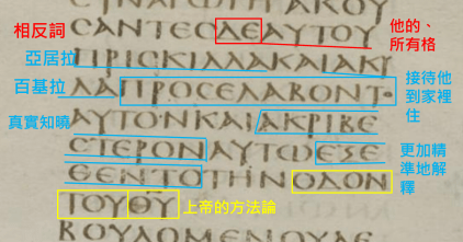 亞居拉(妻)百基拉(夫)雖然不飽足於亞波羅的所講內容,但沒有當面嗆槓亞波羅,乃是用「基督的方法論」去拓荒他。請看附圖的藍線藍框藍字部分,兩道藍線分別是亞居拉(妻)和百基拉(夫),接著第1個藍框藍字是「接待他到來家裡住」,這個西奈抄本之原字甚難譯成中文,本譯文是根據七十士譯本而譯出。此字出現凸顯出他們夫婦是做出第二版之七十士譯本的撒上12:22、詩18:16、詩27:10、詩65:4、詩73:24,可歸納這些處而得出精準的原意是「供應他食衣住行,為的是要引導他予精準的基督耶穌之方法論。」