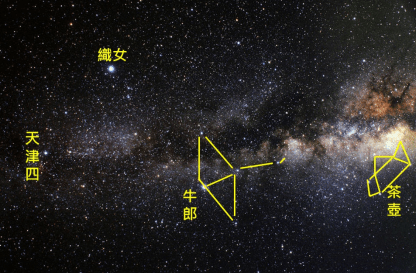 現代「國際天文聯合會」所官式暢通的88天文星座之一,有名叫「百基拉家族星座(The Aquila)」者,中譯名叫「天鷹座」,其裡面的最亮星叫「牛朗星」。所謂「夏季大三角」,這是環球超級統一的名稱,就是指「牛朗星、織女星、天津四星」這三顆最亮星。「天鷹百基拉」的脖子正飛向南方的「銀河」亮處,後者裡面有8顆亮星合成一個「茶壺」形狀,有壺蓋、壺嘴、壺身、壺柄、等等齊全。在台灣「銀河」能被觀賞到的地點局限於天空非常暗黑者、且自行開車方便可抵達者,如合歡山、塔塔加遊客中心、中央大學鹿林天文台、鵝鑾鼻、台東三仙台跨 海步橋、等等。