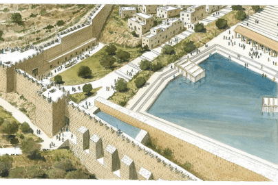 其中『聖潔銅』是希伯來原文字的意思,這是指聖經被施政於全國。『兩山』在哪裡呢?因為亞6:13說:「許幹在『兩職』之間籌畫繁榮,一職是『王權』,另一職是『祭司權』。」,所以請看附圖,耶穌時代耶路撒冷模型,其右上角有『聖殿山』,是『祭司權』的辦公地點,和『大衛山(形狀像一根香蕉)』是『王權』的辦公地點。再請看另一附圖,模型的較詳細者,圖下方是城牆的結束處,此城牆的外邊就是『那兩聖潔銅山的中間』。『兩山』是『聖殿山』和『大衛山』。