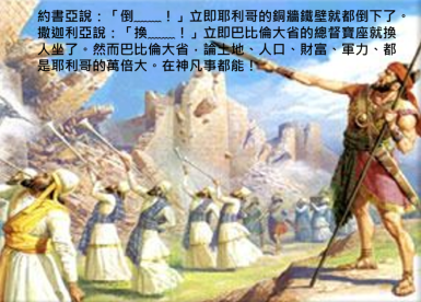 耶和華的「悄悄說」和撒迦利亞的「大聲說」是同步的。表皮是撒迦利亞說『換』,真實是耶和華說『換就換』;這個「換」是指巴比倫大省之政權被撤換輪替了,只有耶和華擁有這能力!從前嫩的兒子約書亞就大聲說:「倒﹏﹏!」於是耶利哥的銅牆鐵壁就都倒下了。耶和華的「悄悄說」和約書亞的「大聲說」是同步的。表皮是約書亞說倒,真實是耶和華說倒就倒。