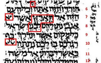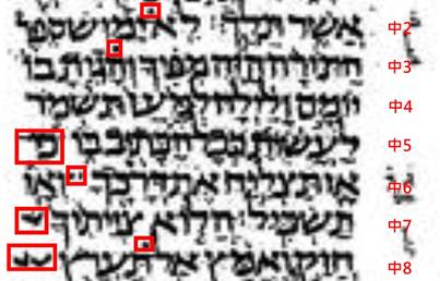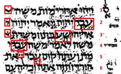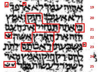 請看附圖的右邊一欄數字,1、2、3是表示第1列、第2列、第3列,其餘類推。請注意有3個大尺寸的字,第1個大尺寸字位於第2列的頭一個字(希伯來文是從右向左書寫)是「僕人」,請注意它的尺寸比其餘常態字的尺寸大了一點,顯明「僕人」是被加強凸顯了。「僕人」這個字也出現於第4列的紅框裡面,但它是常態的尺寸。