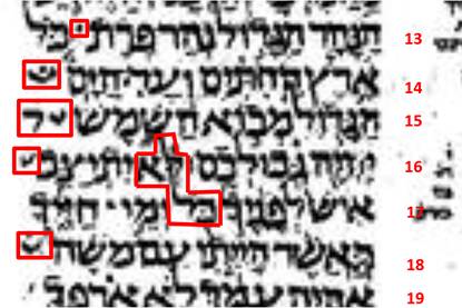 「堅毅的」這個希伯來文前身字出現於第3列的最後一字,用紅框標示出來。在「第3列的最後一字 + 次一列的首字」應該譯作「堅毅的摩西」。雖然「第7列的最後一字 + 次一列的首字」可以譯作「堅毅的我(耶和華上帝)」,但是中文之「堅毅的」這個形容詞不適宜用在上帝的身上(尊敬之上帝的品德),故用相似的字意譯作「恆常信實守『約』的我(耶和華上帝)」。