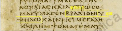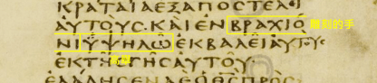 保羅的肢體語言請看西奈抄本如附圖,上面的紅框紅字是「在…的當中(介系詞)」,根據希臘文法「此紅框紅字 + 所有格形式的受詞」是譯作「在…的當中」;這裡的「所有格形式的受詞」是兩個黃框黃字「彫刻的手 + 高舉起來」;這兩個黃框黃字和出6:1(也用黃框黃字,請回看6.3)和出6:6(也用黃框黃字,請回看6.3)一模一樣,三個附圖都各出現「彫刻的手高舉起來」,這證實保羅的肢體語言是在釋放「耶和華獎賞門徒予數量龐大的神蹟集團」之訊息,接聽人一看到保羅的肢體語言也就產生一模一樣的共識。這個共識在住埃及時代已經存在於希伯來人當中,已持續一段時日了。