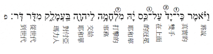 再繼續探討重音,附圖是列寧格勒抄本裡的出17:16,特別用兩個紅框標出兩個重音字「單數一隻手 + 耶和華」〜注意其中的『耶和華』特別被抬上到次行的排頭,所以發音時,『耶和華』須比『單數一隻手』用更大聲量。於是加入吟詠的聲調之後,第一個感歎詞的全部五個字是如附圖。
