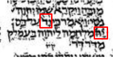 列寧格勒抄本的出17:16,兩個重音字,〜〜「單數一隻手(在左邊的紅框內)」和「耶和華(在右邊的紅框內)」。