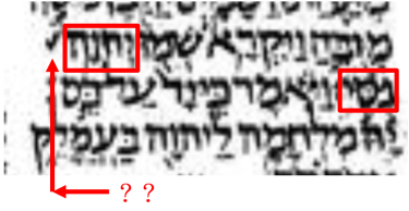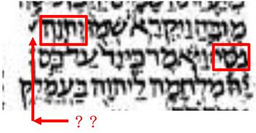 列寧格勒抄本的「耶和華尼西,出17:15」。在左邊的紅框內者是「耶和華」,在右邊的紅框內者是「尼西」,在這兩個字的中間出現了「??」,這是印刷版的希伯來文聖經所沒有者。幸好根據亞9:16,「??==被屢屢頻頻地」。
