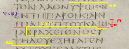 請回看第一個附圖:第一個黃框黃字和其餘所有黃框黃字是同一字根,是『高舉』,且有一個直接受詞是『以色列的祖宗』,亦即上帝『高舉以色列的祖宗』。紫框紫字是『寄人籬下、被擄被暴虐、無所有權、等等』的意思。徒13:17的前半小節,其整個句子,依照西奈抄本的先後次序,精準地譯作:「這以色列民的上帝揀選了我們的祖宗,『高舉他們』於寄居之時埃及之地。」。