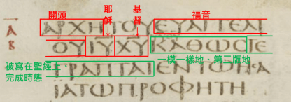請看附圖,西奈抄本的馬可福音開頭,紅框紅字和綠框綠字之間有一些雜音字,是「上帝的兒子」。梵諦岡抄本比西奈抄本多出「上帝的兒子」這個名字,便是「上帝的兒子、耶穌基督之福音的開頭」。 這就是現代眾版之中文譯本與眾版之英文譯本。沒有這些雜音字證實羅馬皇帝正在興起文字獄破害基督教會。羅馬皇帝被抬高頭銜作「上帝的兒子」,他自己也喜歡這個頭銜,就下令禁止眾宗教使用這個頭銜,但皇帝容許「基督==耶穌」,因為「基督」僅僅是眾宗教裡面之一種。