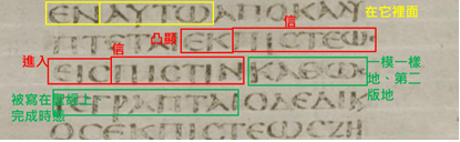 茲舉一例:西奈抄本的羅1:17如附圖,圖中的綠框綠字和前附圖的綠框綠字一模一樣。精準的翻譯為:『凸顯信和進入信』正在第二版地被你們寫在聖經上,且你們口口相傳共識它為第二版的哈巴谷書。