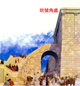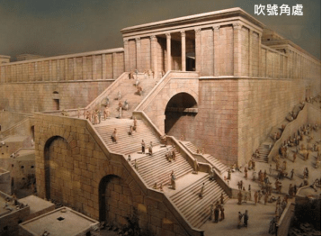 請看諸附圖,1968年發現了好幾塊大巨石,合併起來,上面有銘文說「吹號角處」,它們是耶穌時代的真跡,位於耶路撒冷的聖殿。考古學者們作了逆向工程的研究,把它們歸回原位,就定讞出如最後三附圖。「吹號角處」的垂直正下方,就是聖殿西南角的進出門口,它是使用最頻繁的進出門口。馬可13:1-2,『從殿裡出來』的時候,(此霎時的地點正就是「吹號角處」之垂直下方的進出門口)有一個門徒對耶穌說:「夫子,請看,這是何等的石頭!何等的殿宇!」,耶穌對他說:「你看見這大殿宇嗎?將來在這裡沒有一塊石頭留在石頭上,不被拆毀了。」。主後70年,果真「吹號角處」就被拆毀成「沒有一塊石頭留在石頭上」了。