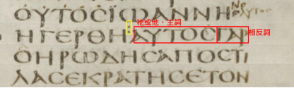 請看附圖,西奈抄本的馬可6:17,在那個「文字獄簡寫」之後的句子是「希律王已下囚了施洗約翰。」,所以「文字獄簡寫」是作為副詞片語,修飾希律王的動作,適宜譯作「在文字獄法案的授權之下,希律王就下囚了施洗約翰。」。但是請看「文字獄簡寫」之前的句子(未用框凸顯之),是「希律王說:『是我所斬首的施洗約翰,他復活了!』」〜〜希律王懺悔地坦承他已得罪了那位能叫死人復活的上帝。所以附圖黃框裡面的那兩個小點,適宜譯作「該文字獄法案是激怒上帝的。」。讀經的人必須心照不宣,但禁止做出任何表態的形式。
