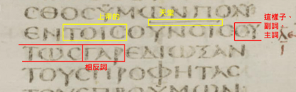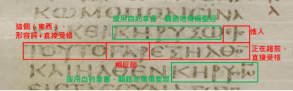 附圖還有兩個綠框綠字,是同一字,譯作「闢路地傳揚聖經」,這個西奈抄本之原字是援用自七十士譯本之約拿書3:2-7,其意思有兩層,一是冒著文字獄的危險,另一是做出第二版約拿書3:2-7,去闢路地宣揚聖經。第二個綠框綠字的前一字,未用框者,是「出來」,但為了充分達意適宜譯作「表態出來、公開出現、挺身出來」。