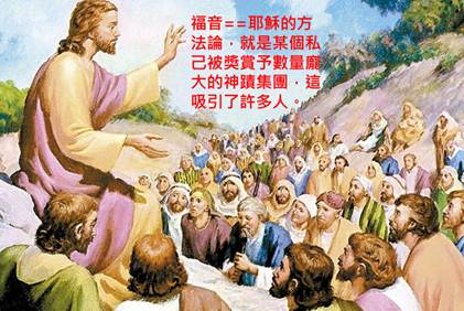 「福音==耶穌的方法論」,就是某個私己被獎賞予數量龐大的神蹟集團,福音的目標是拯救人民,後者正在被魔鬼執政黨暴虐蹂躪。人民雖然揭竿而起,可惜已百戰百輸,甚至有生命危險。
