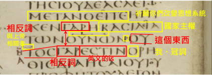 第2列的黃框黃字是「祈願你們改變思想系統」。第4列和第5列各有一條橫線都用黃框凸顯之,這是「與上帝相關之人事時地物型」之標點符號。第3列的紅框紅字是「相反詞」字,意思是「反文字獄」。馬太福音3:2的直接翻譯,依照西奈抄本的先後次序,為「祈願你們改變思想系統,天堂的國家主權正在趨近。」,那霎時的情境背景是,有施洗約翰出來,在猶太的曠野做出第二版的「七十士譯本」約拿書3:2-7,說:「祈願你們改變思想系統,天堂的國家主權正在趨近。」。