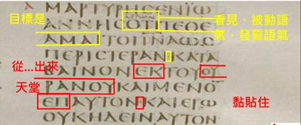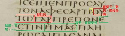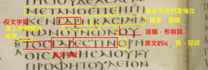 請繼續回看西奈抄本的馬可1:2-3,紅框紅字之後的黃框黃字,第1個黃框黃字是【who、which、供連接用途的關係代名詞、『單數的我』】,第2-3個黃框黃字是【『他』將要建立起祢的方法論。】,黃框黃字的句子主詞是『單數的我』,動詞是『他』將要建立,這是『聖經的堅毅僕人(請參考本網站第7章「解鞋帶」)』之特殊專用文法,意思是說,這位『他〜〜上帝的單數使者』將堅毅地建立起凡上帝所吩咐他的,請上帝享受凡他所做的。幸好路加福音4:14有定讞出來它們是什麼意思,故譯作『【正在臉顏〜〜大輪子爆炸掉韃虜之前面發誓】的我的單數使者,將要建立起祢(耶穌)的方法論。』。