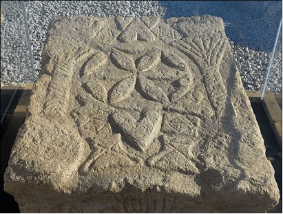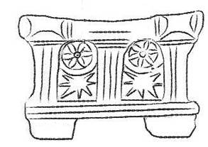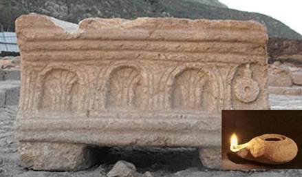 「撒迦利亞的聖經書桌」之長邊側面圖,兩個長邊側面圖一樣。圖內的最右是一個油燈;它的典故是主前76年的獻殿節。圖外的右下角另插入一個考古油燈圖作為輔助說明。