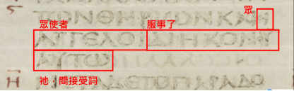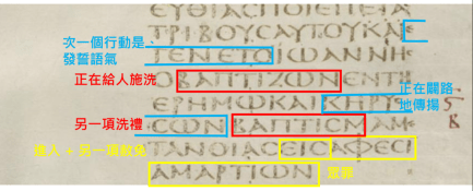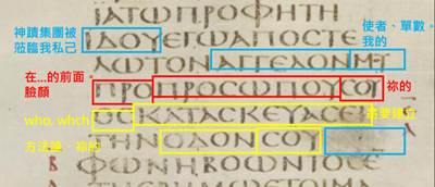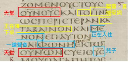接著請回看西奈抄本的上述3個附圖,馬可1:2-3、賽6:7、賽6:8,每個附圖各都出現一處用藍框藍字者,其被框出的字眼讀者能夠確定是一模一樣,故每字眼都譯作【耶和華的神蹟被蒞臨我私己!】。附圖的馬可1:2-3,其第3列還有兩個藍框藍字,是【使者、單數 + 我的】,其第2-3列未用藍框藍字者,是【我正在差遣】,故全部的藍框藍字處是【耶和華的神蹟蒞臨!我正在差遣我的單數使者。】。