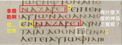 第2個紅框紅字之前的那個黃框黃字是「從……、介系詞」,所以約翰福音1:46被譯作:「從『拿撒勒啊!』出來了!獨一真神正在做出第二版聖經裡面的許多真善美之神蹟集團,然而,到底有什麼天堂的神品至寶要蒞臨我呢?」。