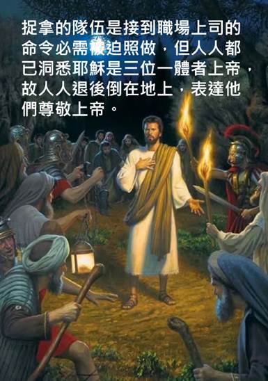 到了主耶穌的時代,人人都知道:「我是==自有永有者==三位一體者上帝」;「我是」擁有撲人倒地的震撼力。當耶穌在客西馬尼園時,耶穌和捉拿祂的人對話。耶穌對他們說:「你們找誰?」他們說:「找拿撒勒人耶穌。」耶穌說:「我就是。」,耶穌一說我就是,他們就退後倒在地上(約翰18:6)。為什麼捉拿的隊伍如此敏感呢?因為猶太文化把「我是==自有永有者==三位一體者上帝」。捉拿的隊伍是接到職場上司的命令必需被迫照做,但人人都已洞悉耶穌是三位一體者上帝,故人人退後倒在地上,表達他們尊敬上帝。