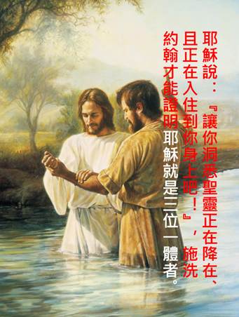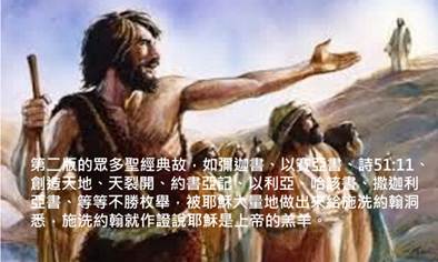 | 耶穌受洗,當場獎賞施洗約翰予第二版的以賽亞9:1-2、亞第3章、約書亞記第3章、王下第2章、亞第14章、彌迦書1:3、創世記第1章、多得不勝枚舉,施洗約翰才能作見證,說出『聖靈洗禮』之詳細內容。 |