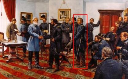 附圖是美國南北戰爭的「林肯軍勝利(深藍色軍裝),南軍投降(淺藍色軍裝)」圖, Appomattox,維吉尼亞州,1865年4月9日,謝謝「美國國立公園管理署」禮讓版權。用紅框框住者是林肯總統的兒子,他在聆聽勝利軍的司令正在傳達總統的敕令:完完全全地赦免仇敵〜〜仇敵不必賠償分毫和不被囚,給予仇敵的生命與財產之安全保障,和仇敵諸州的重建。