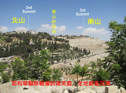 「亞14:10,全地都將有死屍圍繞著,像亞拉巴(死海)一樣;從迦巴直到耶路撒冷南方的臨門。」〜〜那一霎時,扮演亞述人的城外派和扮演耶利哥人的城內派把耶路撒冷城外填滿成「死海」了! 於是,附近的每一條路上,都可見死屍!【這就是當時人的興奮!】「搞笑戲」的最遠地點是在橄欖山的山頂上,因為安息日有規定:最遠只能離開聖殿1100公尺。(備註:徒1:12:「安息日可走的路程。」)