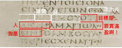 請看附圖,西奈抄本的路加5:8,最後一個紅框紅字之附近處有一個雜音字,本文要依照無雜音字來翻譯。第一個紅框紅字是「目標是…」,它的補語是在它後面所尾隨的三個紅框紅字,依序是「人 + 罪貫滿盈啊! + 我是、狀態動詞」,其中「罪貫滿盈」是希臘文法的呼格,必須譯作「罪貫滿盈啊!」,這三個紅框紅字是倒置句子,主詞和動詞被寫在最後〜〜「我是、狀態動詞」,所以這三個紅框紅字直譯作「我是一個罪貫滿盈的人啊!」,茲再加入第一個紅框紅字,就直譯作「我的目標竟是作一個罪貫滿盈的人啊!」。