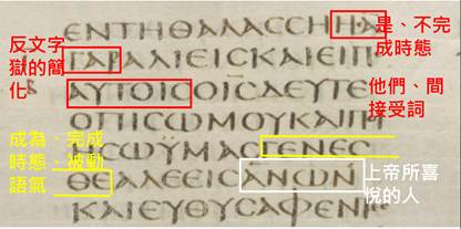 第6個證據是附圖的黃框黃字,是『成為、完成時態、被動語氣』,此附圖是照抄自西奈抄本0102小座祭壇的中心主旨,亦即被現代眾版之中文譯本譯作「『成為』得人如得魚」的那個地方。中文譯本裡面的『成為』這個字,在西奈抄本裡面是完成時態 + 被動語氣。希臘文法的「完成時態」比較起中文文法和英文文法,除了相同地能翻譯作現在完成式、現在式、現在進行式之外,還多一層「已經轉型、正在轉型」的意思,請參考本網站8.1。轉型的定義是它包涵著來源者和後展者這兩項,然而後展者須佔據總意義權重的90%以上。