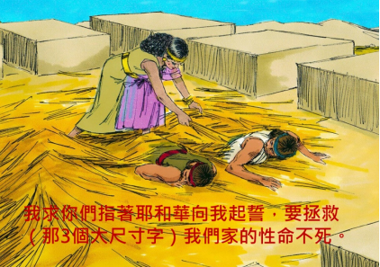 在耶利哥城牆上有一難民名叫「喇合」,她說,(書2:12-13)「現在我求你們指著耶和華向我起誓,要恩待我父家,並給我一個實在的證據,要救活我的父母、弟兄、姊妹,和一切屬他們的,拯救(列寧格勒抄本裡面的那3個大尺寸字,請參考本網站第5章)我們性命不死。」。喇合的家庭曾逃出了埃及奴隸之枷鎖,抵達耶利哥;何竟又淪作了示劍王的奴隸~~她們的生活根本未獲拯救。但她的家庭已知悉「拯救的耶和華」之事實,故渴望「拯救的耶和華」蒞臨到她的家庭。