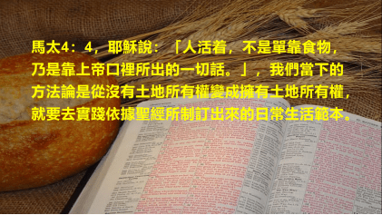 合併這兩處大尺寸的字眼,其意思就是「『從沒有土地所有權變成擁有土地所有權』的方法論是:要去實踐依據聖經所制訂出來的日常生活範本。」。